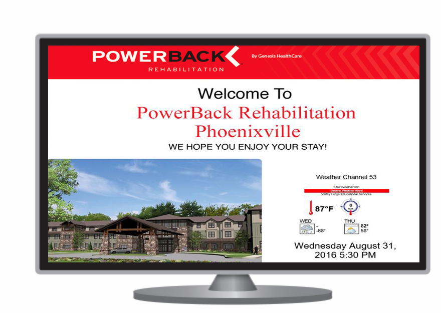 Developed state-of-the-art digital signage systems in multiple Genesis HealthCare PowerBack Rehabilitation facilities around the region. The signage system was installed so that it worked in conjunction with the existing cable television service in each of the patient’s rooms. This allowed for each patient to tune into certain channels to receive all of the information posted centrally by Genesis staff.