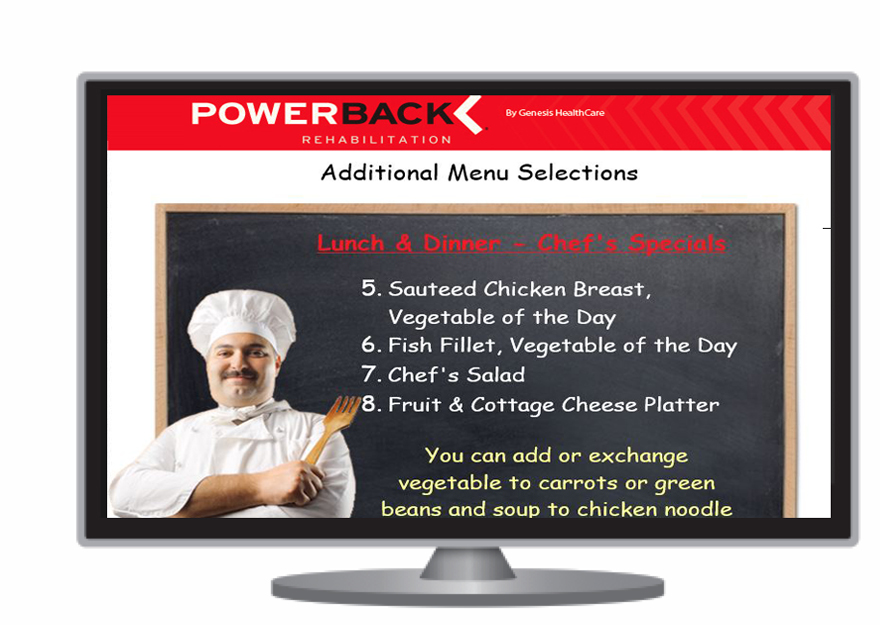 One of goals of PowerBack Rehab facilities was to provide a hotel experience for all their guests. Beautiful upscale dining rooms were built and patients now have the capability to order meals ahead of time and dine in a beautiful setting as well in their rooms for convenience. Daily, weekly and “always available” menus were prominently displayed.