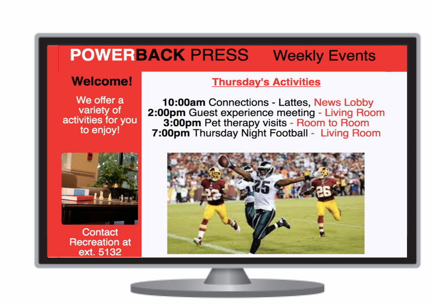 Genesis Healthcare provides long- and short-term rehabilitation services at more than 400 locations across the country and aim to give their patients the best possible experience. PowerBack Rehabilitation, Genesis HealthCare’s premier short-term rehabilitation product, utilizes Digital Signage to keep its short-term patients informed about what’s happening around the facility. PowerBack provides state-of-the-art facilities and highly personalized care plans designed to get patients home sooner.